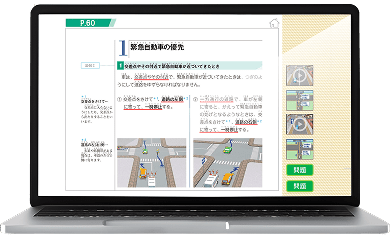 教室スクリーン(テレビモニター)に映した学科教本ページに沿って教習を進めながら、効果的なスライドコンテンツで解説できるデジタル教習ツールです。操作はクリックのみ。