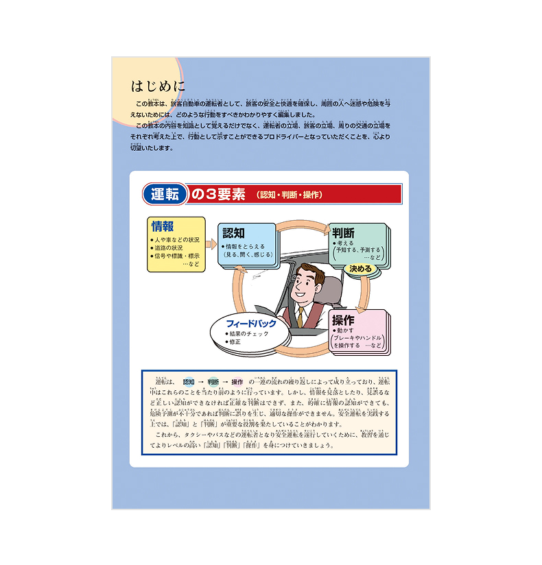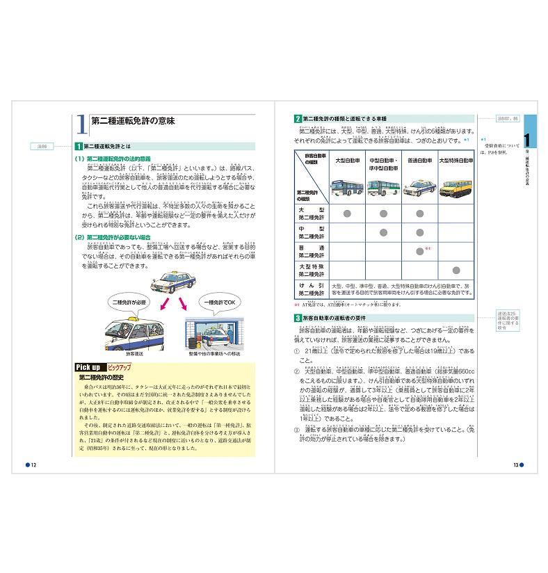 「交通の方法に関する教則」に完全準拠しており、二種免学科試験の内容を網羅しています。(「旅客自動車運転者に対する安全運転の知識」を除く。)旅客自動車の運転者に必要な法令の知識はもちろん、実際に旅客運送業務についた場合の参考知識も掲載しつつも、知識として覚えるだけでなく、運転者の立場、旅客の立場、周りの交通の立場をそれぞれ考えたうえで、行動として示すことができるプロドライバーになってもらえることを願って作成しました。