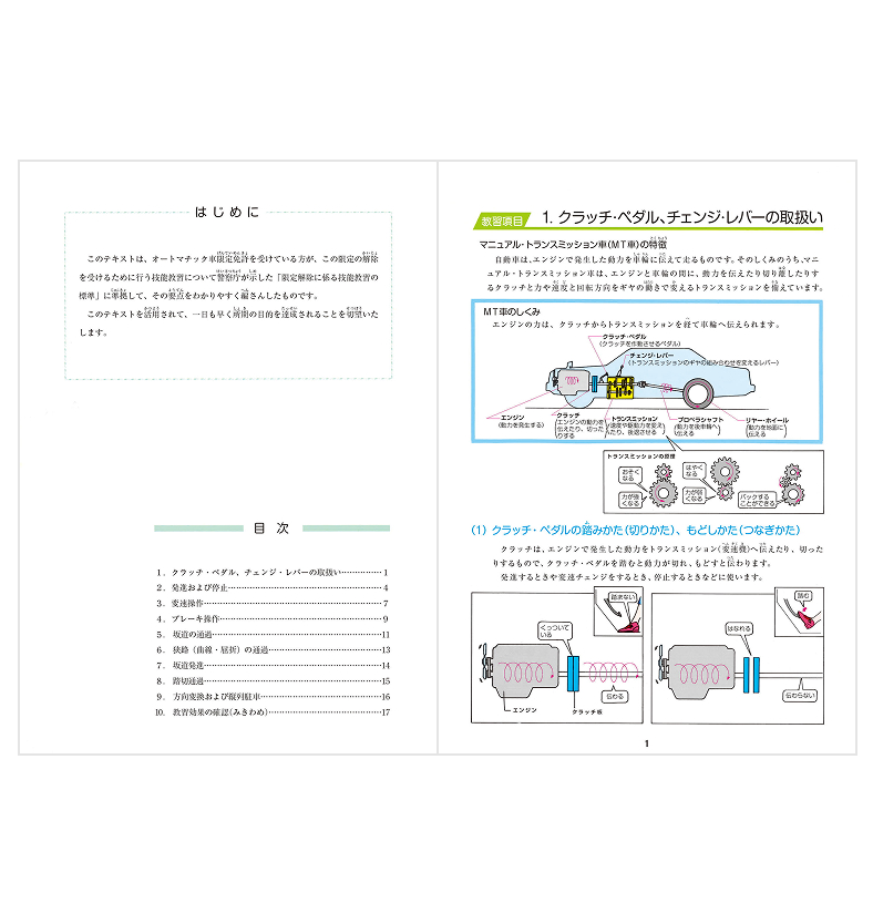 MT車の基本構造から操作方法、技能の習得ポイントの要点をまとめました。MT車特有のギア操作やクラッチ操作といった分かりにくい部分を多くのイラストを使い分かりやすく解説しており、この一冊でMT車の操作ができるようなテキストとなっております。