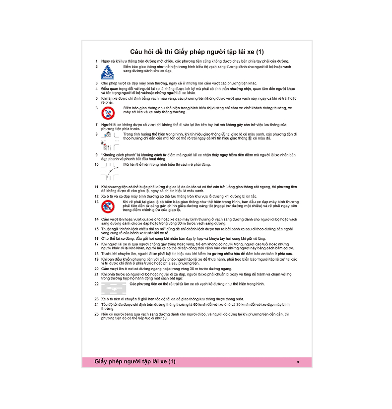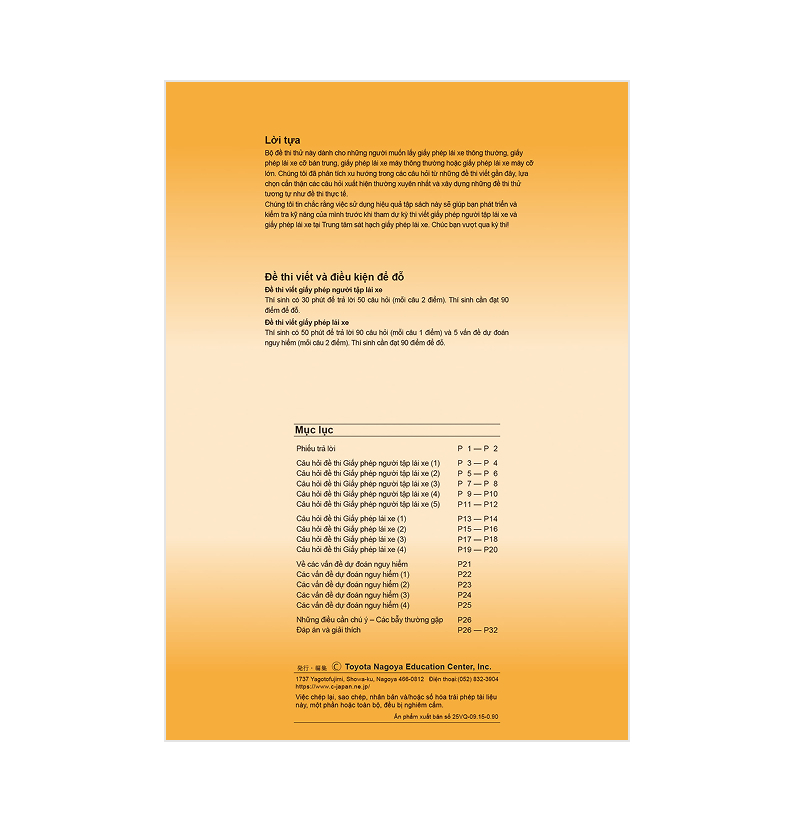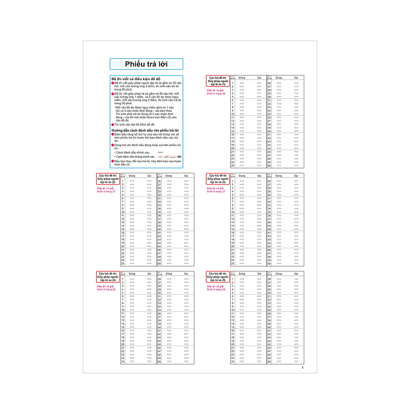 Đây là bộ đề luyện thi được thiết kế theo dạng thức của kỳ thi lý thuyết giấy phép lái xe tạm thời và kỳ thi lý thuyết giấy phép lái xe chính thức. Bạn có thể làm bài kiểm tra mô phỏng giống như thi thật bằng cách điền đáp án vào phiếu trả lời đi kèm. Rất phù hợp cho những ai muốn thử sức mình.