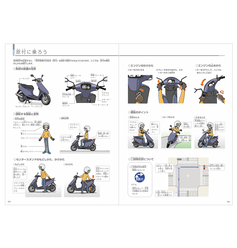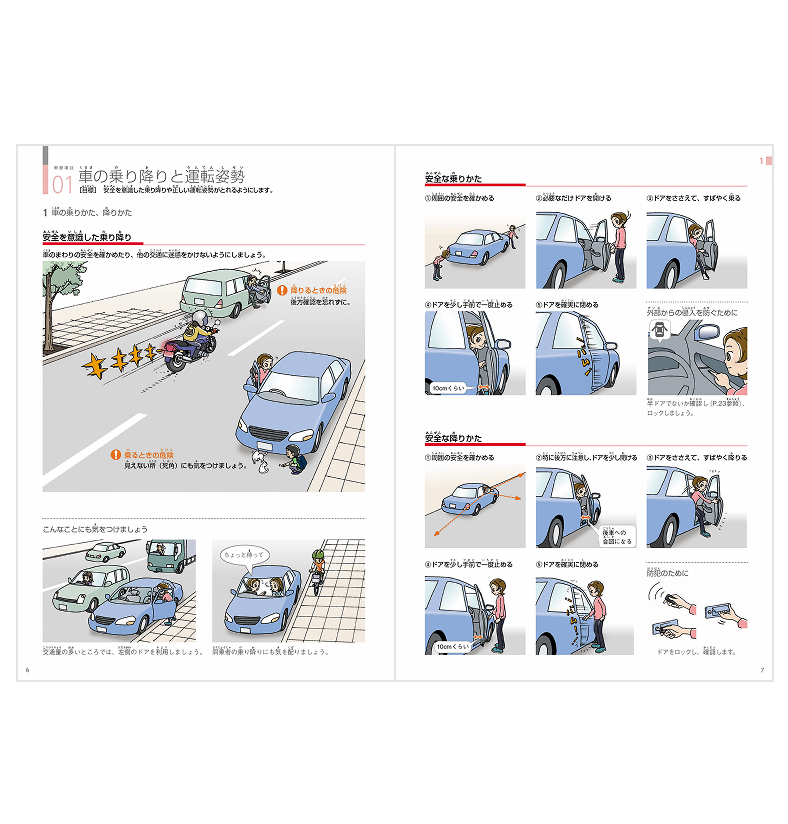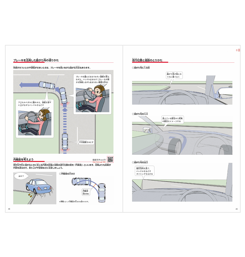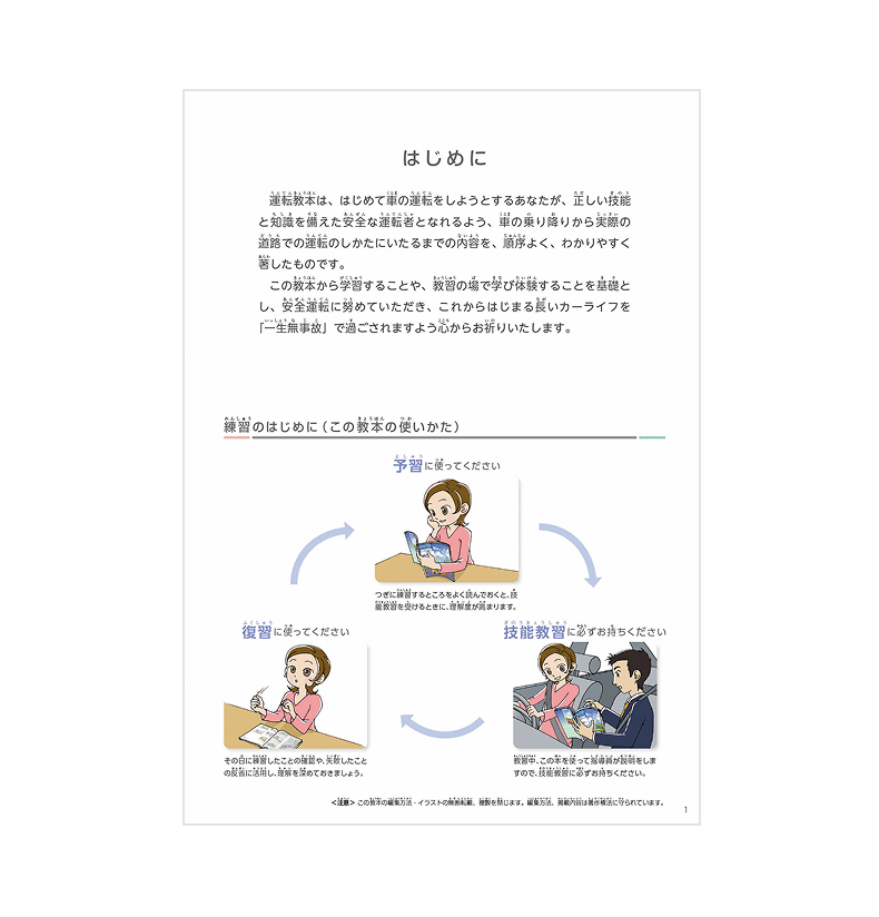 初心者でも運転場面をイメージしやすく、教習でも使いやすいようにイラスト中心で構成してあります。