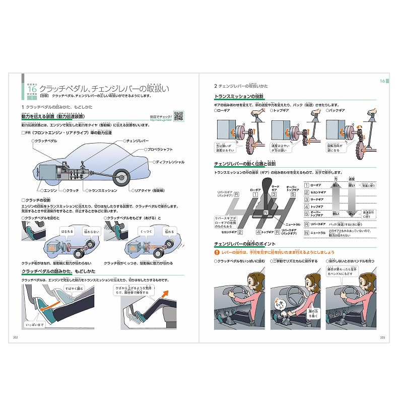 基本的な車の操作の仕方から路上での応用運転まで、指定自動車教習所の教習カリキュラムに従って編集されています。